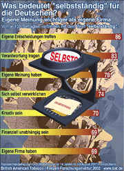 Arbeitsplatzabbau und hohe Arbeitslosigkeit stehen auf der einen Seite, wachsende Hoffnung auf neue unternehmerische Ideen und Existenzgründungen auf der anderen. Ein Ausweg aus der Beschäftigungskrise könnte der Weg zur Selbstständigkeit sein. Doch bei dem Wort Selbstständigkeit denken die Deutschen mehr an ein Persönlichkeitsmerkmal und weniger an eine Unternehmensgründung. Die „eigene Meinung“ (78%) ist den Bundesbürgern wichtiger als die „eigene Firma“ (69%). Selbstständigkeit im Leben beweist, wer „eigene Entscheidungen treffen“ kann (83%). Dies geht aus der neuen Forschungsstudie des Freizeit-Forschungsinstituts der British American Tobacco hervor, in der 5.000 Personen ab 14 Jahren in Deutschland nach ihrer Einstellung zur Selbstständigkeit im Leben und im Beruf befragt wurden.