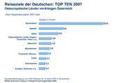 Spanien wird sicher seine Spitzenposition unter den ausländischen Reisezielen behaupten können (8,6%). Auch die Renaissance des Italien-Tourismus setzt sich fort (6,9%). Österreich hingegen droht weiter an Boden zu verlieren (4,5%). Die Urlaubsanbieter in den osteuropäischen Ländern Ungarn, Tschechien und Polen (4,6%) sind dabei, Österreich von dem angestammten Spitzenplatz zu verdrängen. Das hat es in den letzten vierzig Jahren noch nicht gegeben. Osteuropäische Reiseziele ziehen immer mehr deutsche Reisende an.