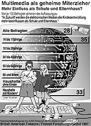 A comparison of the last two years shows that the fear of the multimedia age in Germany is slowly receding. Fewer and fewer Germans are mourning the old ARD and ZDF days (1996: 32% - 1997: 27%). The fear of loneliness is also decreasing (1996: 57% - 1997: 55%). And even the group of opponents who do not want the wide range of media on offer is no longer growing (1996: 39% - 1997: 39%). The signs of a downward trend in media phobia are increasing. Information campaigns on a broad scale and the growing media competence of the younger generation are taking the edge off the acceptance problems.