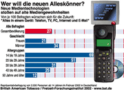The brave new world of mobile internet is said to be just around the corner: The start of a media era in which everything is networked with everything else and mobile phones can do everything: „all-rounders“ - a new generation of devices is now waiting for a new generation of users. Everything in one device? TV, PC and Internet, plus e-mail and telephone or even a mobile phone? One in four Germans would like to have such new multi-purpose devices. Two thirds of the young SMS generation (64%) aged between 14 and 24 are enthusiastic about this technological innovation. However, almost three quarters of the population say: „No, thanks!“ They would prefer to simply flick through the TV channels as before, stating „For me, everything will stay the same in the future“ (B-A-T Freizeit-Forschungsinstitut 2002).