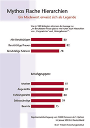 Aus der Sicht der Arbeitnehmer hat sich fast nichts verändert: "Im Berufsleben heute gibt es wie früher auch Hierarchien von ‚Vorgesetzten‘ und ‚Untergebenen’" sagen 80 Prozent der befragten Berufstätigen (Frauen: 82% – Männer: 78%). Lediglich die Berufsgruppe der Selbständigen, die für sich selbst verantwortlich ist, hat eine etwas positivere Meinung (75%). Ansonsten hält die überwiegende Mehrheit der Beschäftigten sogenannte "flache Hierarchien" für eine Legende bzw. für ein inflationär gebrauchtes Modewort. Wie vor fünfzig oder hundert Jahren auch dominiert in den Betrieben die Hierarchie von Vorgesetzten und Untergegebenen, die nicht nur eindeutig festlegt, wer wem unterstellt ist, sondern auch klare Anweisungen gibt, was wie zu tun ist. Offensichtlich erwarten die meisten Arbeitnehmer auch im 21. Jahrhundert klare Aufgabenverteilungen und verbindliche Anforderungsprofile: Aufgaben durch Vorgaben.