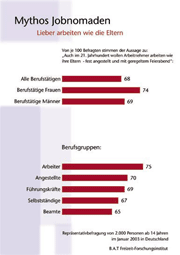 Was Arbeitnehmer wirklich wollen, sind geregelte Verhältnisse, also Festanstellungen und keine Zeit- oder freien Mitarbeiterverträge. Fast drei Viertel (71%) aller Berufstätigen geben unumwunden zu: Auch im 21. Jahrhundert wollen sie "arbeiten wie ihre Eltern – fest angestellt und mit geregeltem Feierabend." Natürlich ist dies auch eine Generationenfrage. Mit zunehmendem Alter lässt die Lust an ungeregelten Arbeitszeiten und -verträgen verständlicherweise nach. Nach geregeltem Feierabend rufen am lautesten die 40- bis 49-Jährigen (75%). Aber auch die jungen Leute im Alter von 18 bis 34 Jahren wollen lieber konventionell wie die Eltern arbeiten (63%) und können sich auch im 21. Jahrhundert für Flexibilität und Mobilität im Berufsleben (33%) deutlich weniger begeistern.