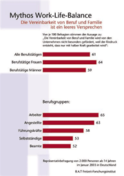 Der rapide Anstieg von Stressbelastung und psychosomatischen Beschwerden hat in den letzten Jahren die amerikanische Work-Life-Balance-Bewegung nach Deutschland schwappen lassen. Mit der Vereinbarkeit von Beruf und Familie soll endlich Ernst gemacht und die Grenzen zwischen Arbeit und Freizeit sollen fließender werden. Im Mittelpunkt soll wieder der "ganze Mensch" stehen und nicht mehr die Arbeit ohne Anfang und Ende. Doch die Wirklichkeit sieht anders aus: Die Arbeitswelt 2003 kann (oder will) den Anspruch einer Balance von Arbeit und Leben nicht einlösen. Der Gegensatz von Berufs- und Privatleben bzw. die weitgehende Unvereinbarkeit von Beruf und Familie bleibt weitgehend erhalten. Die Arbeitnehmerschaft findet hierfür eine realistische Erklärung: "Die Vereinbarkeit von Beruf und Familie wird von den Unternehmen nicht besonders gefördert, weil der Eindruck entsteht, dass nur mit halber Kraft gearbeitet wird" sagen fast zwei Drittel (62%) der Berufstätigen. Der Eindruck entsteht: Die Idealvorstellung aus unternehmerischer Sicht sieht eigentlich so aus: Halber Lohn + halbe Arbeitszeit = volle Leistung. Individuelle "Arbeit-à-la-carte" hat noch immer unter dem öffentlichen Leitbild der Vollbeschäftigung zu leiden: Wer das Familienleben so wichtig wie das Berufsleben nimmt, sieht sich Verdächtigungen von mangelnder Arbeitsmotivation über Arbeitsunlust bis zu Faulheit ausgesetzt.