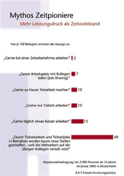 Zeitpioniere gelten als Leitbild einer neuen Leistungsgesellschaft, weil für sie Zeitwohlstand genauso wichtig wie materieller Wohlstand ist. Ganz bewusst arbeiten sie weniger, um mehr Zeit für sich und die Familie zu haben. Ihre Arbeit verrichten sie motiviert und leistungsbereit wie Vollzeitbeschäftigte auch. Doch zwei Drittel der Berufstätigen (60%) müssen im Arbeitsalltag die Erfahrung machen: "Durch Teilzeitarbeit und Teilzeitjobs in Betrieben werden kaum neue Stellen geschaffen, weil die Mehrarbeit auf die übrigen Kollegen verteilt werden" (berufstätige Frauen: 60% – berufstätige Männer: 62%).