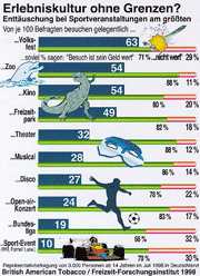 Der hohe Enttäuschungsgrad im Sportbereich ist wesentlich darauf zurückzuführen, daß sich der Zuschauer-Sport immer mehr zum Tele-Sport wandelt: Im Fernsehen kann der Sport perfekt inszeniert werden. Live-Zuschauer im Stadion oder an der Rennpiste müssen dann vielfach enttäuscht feststellen, daß die Sport-Wirklichkeit das gar nicht bieten kann. Professor Opaschowski: "Die Gefahr ist groß, daß es beim TV-Sport mehr um Show und Spektakel geht und die Zuschauerkultur auf der Strecke bleibt. Das Fernsehen ist zwar immer live dabei, aber die Zuschauer werden mehr zur Geräuschkulisse degradiert." So kann der Boom eines Tages zum Bumerang werden. Wenn mehr gepflegte Langeweile als das erwartete "ultimative Match" (Boris Becker) geboten wird, bleiben die Zuschauer in Zukunft immer öfter zu Hause. Es sollte schon zu denken geben, daß die überwiegende Mehrheit aller jungen Leute im Alter von 14 bis 29 Jahren noch nie ein Bundesligaspiel (72%) oder eine andere Sportveranstaltung (82%) besucht hat.