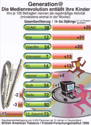 Zur Jahrtausendwende entläßt die erste Medienrevolution ihre Kinder. Noch nie hat es eine Generation gegeben, die von Kindheit an mit elektronischen Medien aufgewachsen und von ihnen in ihrem Lebensgefühl so stark geprägt wurde wie die heute 14- bis 29jährigen. Inmitten von TV, PC, E-Mail und Internet kündigt sich im Zeichen von @ (sprich: ett) eine neue Generation an: die "Generation @". Sie surft in 90 Sekunden um die Welt, telefoniert in allen Lebenslagen, zappt wie im Fernsehen durch das Leben, steht ständig unter Strom und geht den Mitmenschen nicht selten auf die Nerven. Auf diesen Nenner lassen sich die Ergebnisse umfangreicher Repräsentativuntersuchungen des Freizeit-Forschungsinstituts der British American Tobacco bringen. 3.000 Personen ab 14 Jahren wurden im Zeitraum von September 1998 bis April 1999 nach ihren Lebens-, Konsum- und Mediengewohnheiten befragt.