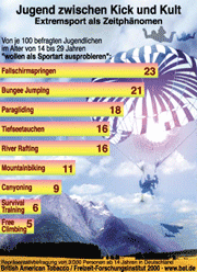 "Extreme Langeweileverhinderung ist das Hauptmotiv von Jugendlichen auf der Flucht vor der Erlebnisarmut des Alltags", so Prof. Dr. Horst W. Opaschowski, der Leiter des Instituts. "Die Jugendlichen haben mehr Angst vor der Langeweile als vor dem Risiko. Und wenn sie bei körperlichen Herausforderungen den ultimativen Kick erleben, haben sie auch den größten Spaß dabei." Spaß heißt für sie: Freude am kalkulierten Risiko. Bungee Jumping (75%), Canyoning (71%), River Rafting (70%) und Freeclimbing (62%) zählen nach Meinung der Befragten zu den riskantesten und wagnisreichsten Sportarten.