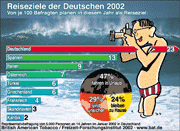 Zudem bekommt Spanien die wachsende Attraktivität insbesondere türkischer Reiseziele immer mehr zu spüren (1999: 3% – 2000: 5% – 2001: 6%). Andere klassische Reiseziele wie Italien (1999: 7% – 2000: 9% – 2001: 8%) sowie Österreich (1999: 5% – 2000: 7% – 2001: 7%) können sich dagegen weiter behaupten.