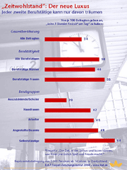 Unter den Berufstätigen nehmen lediglich die Auszubildenden im Hinblick auf die eigene Zeitfreiheit eine privilegierte Stellung ein. Die meisten Jugendlichen (54%) haben täglich sogar mehr als vier Stunden persönliche Freizeit zur Verfügung, „in der sie tun und lassen können, was ihnen Spaß und Freude macht.“ Lediglich die Ruheständler geben an, über noch mehr Zeit in Eigenregie (71%) zu verfügen. Professor Opaschowski: „Das 20. Jahrhundert ging als Jahrhundert der Freizeit in die Geschichte der modernen Arbeit ein. Im 21. Jahrhundert ist mehr Arbeitsproduktivität als Arbeitszeitverkürzung gefragt.“