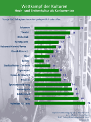 Der Kampf um Kunden, Nutzer und Besucher wird härter und macht auch vor der hohen Kultur nicht Halt. Das öffentliche Kulturangebot bekommt die Konkurrenz der privaten Anbieter im Medien-, Sport- und Unterhaltungsbe-reich immer mehr zu spüren. Die Bundesbürger gehen lieber ins Kino (68%) als ins Theater (55%), mehr ins Musical (41%) als in die Oper (23%) und be-suchen öfter Open-Air- (40%) als Klassik-Konzerte (29%). Dies geht aus einer aktuellen Repräsentativbefragung des B.A.T Freizeit-Forschungsinstituts her-vor, in der 2.000 Personen ab 16 Jahren danach gefragt wurden, welche Frei-zeit- und Kulturangebote sie „gelegentlich“ oder „öfter“ in Anspruch nehmen.