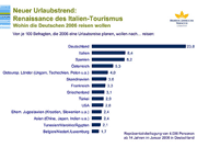 Nur etwa jeder vierte Bundesbürger mit festen Reiseabsichten will 2006 im eigenen Land bleiben (23,8%). Alle anderen zieht es in das europäische Ausland (48,1%) oder in außereuropäische Länder (11,3%). Etwa jeder sechste Befragte (16,9%) hat sich „noch nicht festgelegt.“ Das kann eine Chance für den Inlandstourismus sein. Im Hinblick auf die Auslandsziele deutet sich ein neuer Urlaubstrend an: Renaissance des Italien-Tourismus. Italien kann, wenn die Absichten verwirklicht werden, erstmals Spanien (8,2%) von der Spitzenposition verdrängen (Italien: 8,4%).