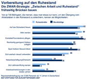Mit steigendem Alter wächst jedoch die Zuversicht. Lediglich jeder fünfte Ruheständler (21%) gibt an, generell nichts tun zu können, um den Übergang vom Arbeitsleben in den Ruhestand zu erleichtern. Dagegen sind zwei Drittel (66%) voller Hoffnungen. Der Ruhestand selbst sollte dann aber möglichst aktiv gestaltet werden. Der Rat der älteren Generation an die Berufstätigen lautet deshalb, sich „immer beschäftigt zu halten“ und bloß „nicht rumzuhängen” (60%) und sich frühzeitig Hobbys zuzulegen (48%). So lassen sich aufkommende Fragen, Zweifel und Probleme wenigstens zeitweise verdrängen – als Beschäftigungstherapie und Ablenkungsmanöver. Jeder zweite Berufstätige sieht dies auch als Chance. Hilfreich erscheint vor allem der Bezug zur Arbeit. In den letzten Jahren vor dem Ausscheiden aus dem Erwerbsleben soll man, so lautet die Empfehlung, die eigene Arbeitszeit freiwillig verkürzen und Jahr um Jahr weniger zu arbeiten versuchen, sich sozusagen „aus der Arbeit wegschleichen“. Der flexible bzw. gleitende Übergang in den Ruhestand wird zudem leichter fallen, wenn zeitgleich nach Nebenbeschäftigungen und ehrenamtlichen Aufgaben Ausschau gehalten wird (24%).
