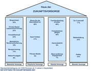 Nur eine private Zusatzversorgung garantiert eine weitgehende Beibehaltung des bisherigen konsumintensiven Lebensstils im Umfeld von Hobby, Sport, Urlaubsreise und Erlebniskonsum. Die Bürger haben dies erkannt und sorgen privat für das Alter vor. Fast drei Viertel aller Bundesbürger (73%) haben materiell für das Alter vorgesorgt – die Westdeutschen (79%) deutlich mehr als die Ostdeutschen (59%). Die Art der Maßnahmen ist dabei vielseitig und variantenreich: