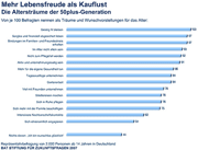 Professor Opaschowski: „Nicht Traumschiffe und Traumreisen stehen bei den Älteren im Zentrum ihrer Wünsche, sondern geistige Fitness, soziale Kontakte und materielle Sicherheit. Letzteres hat wenig mit Wohlstand oder der Anhäufung materieller Güter zu tun. Es geht mehr um die Freiheit von Geldsorgen und Existenzängsten. Sorglos leben, also gut vorgesorgt haben, und finanziell abgesichert sein stehen ganz oben auf der Wunschliste. Diese Kriegs- und Nachkriegsgeneration der Pflichterfüllung will eine Generation der Lebensfreude sein“. Mit dem Lebensalter nimmt die Freude am Sich-Frei-Fühlen deutlich zu. Die Träume vom guten Leben gleichen Wünschen mit Bodenhaftung. Die Älteren wollen mit beiden Beinen im Leben stehen und frei von Sorgen sein. Das ist für sie das höchste Glück.
