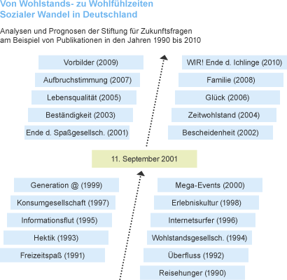 Die Erfahrungen vom 11. September 2001 bis zur Finanz- und Wirtschaftskrise brachten eine Zäsur im Denken und in den Lebenseinstellungen der Bundesbürger: Die Spaßkultur weicht einer neuen Ernsthaftigkeit. In Krisenzeiten ist kein Platz für Egoisten mehr. Das Zeitalter der Ichlinge geht zu Ende. Eine Ära der Nachhaltigkeit beginnt – auch und gerade im zwischenmenschlichen Bereich. Beständigkeit ersetzt Beliebigkeit und Bescheidenheit ist wieder gefragt. Die Bundesbürger rücken enger zusammen und sind sich weitgehend einig: „Wir müssen mehr zusammenhalten“ (Männer: 85% – Frauen: 90%).